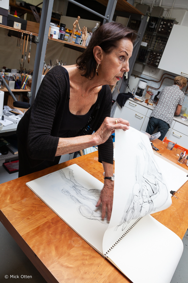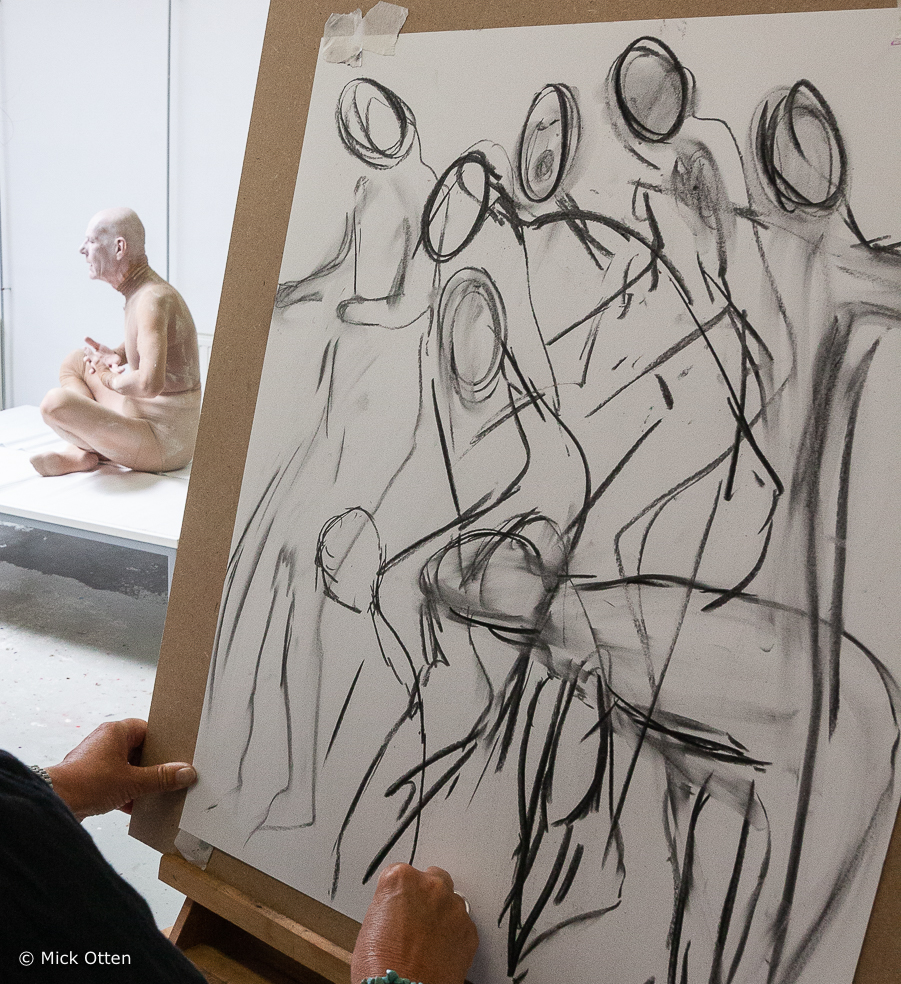 Zoals eerder op onze website aangekondigd, werd op 13 augustus een workshop georganiseerd door Hanneke Wessels in haar atelier. Zij had bewegingskunstenaar John Giskes uitgenodigd om een butoh-performance te geven, waarbij hij als bewegend model diende. Voor de negen deelnemers aan de workshop was dat een prachtige gelegenheid om ’te tekenen naar bewegend model’.