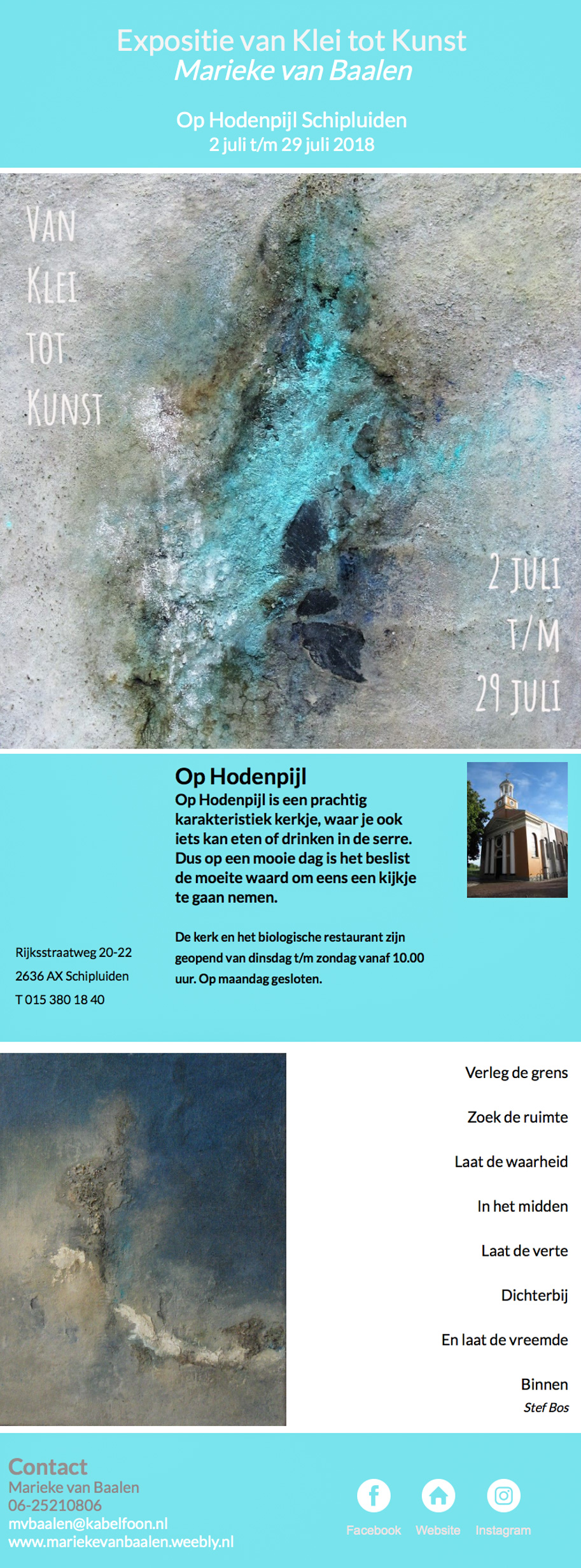 Lees meer2 juli 2018 Maassluise Kunstenaar Marieke van Baalen exposeert van 2 t/m 29 juli haar werk 'van Klei tot Kunst' in Op Hodenpijl. Het adres ...