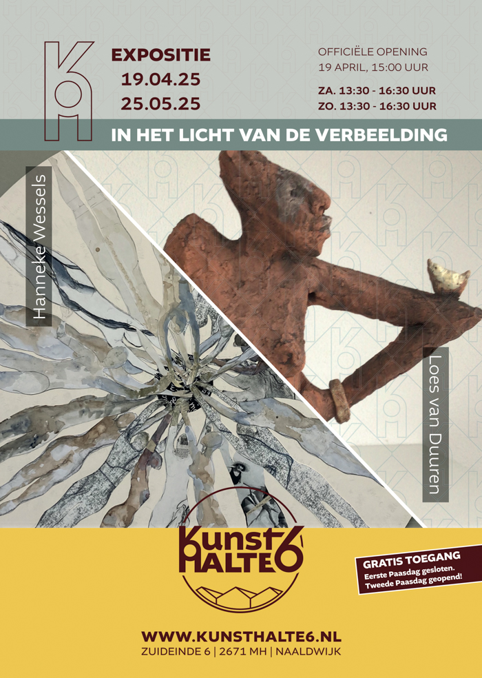 Openingstijden en adres: De expositie loopt van 19 april t/m 25 mei 2025 en is elk weekend te bezoeken in KunstHalte 6, Zuideinde 6 in Naaldwijk. De toegang is gratis. Let op: 1e Paasdag gesloten, 2e Paasdag geopend!