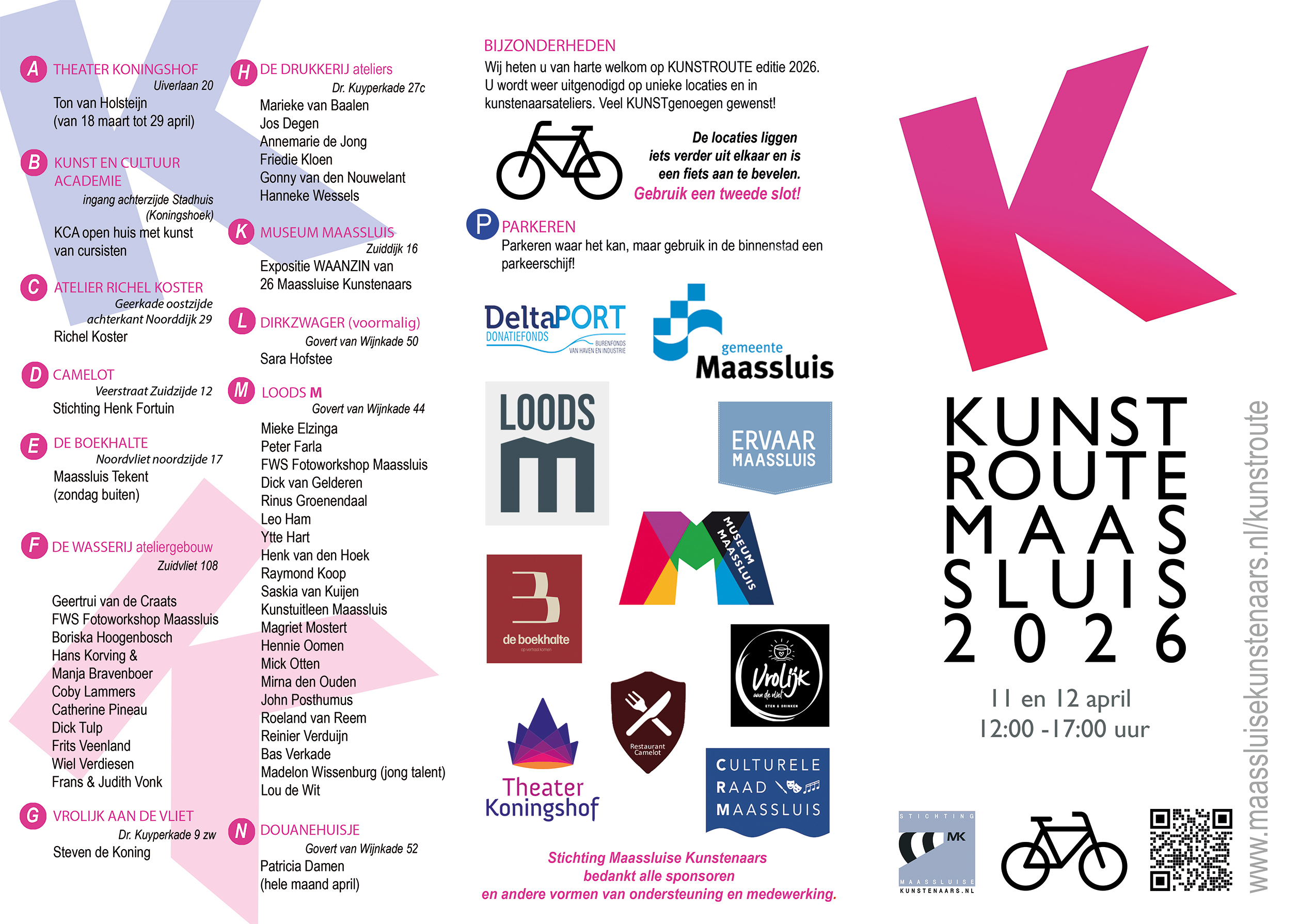U vindt op deze website alle deelnemers en alle locaties. U kunt op deze pagina ook de folder ophalen (klik op de folder hieronder). Als u liever een papieren versie in handen heeft, kunt u die over een paar weken ophalen bij Ervaar Maassluis, de Bibliotheek, Museum Maassluis, Theater Koningshof en de winkels in de binnenstad. Tijdens de route zal die op alle locaties voor u klaarliggen.
