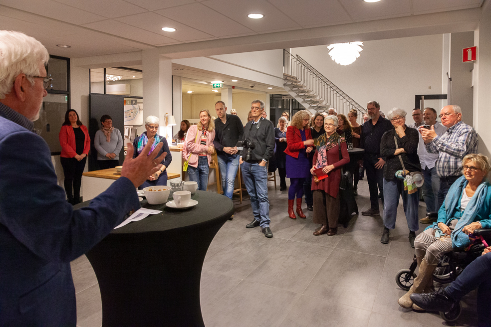 Daarna sprak David over de poster: ‘Ook dit jaar hebben verschillende kunstenaars een ontwerp ingediend en na lang wikken en wegen heeft de daarvoor ingestelde commissie een keuze gemaakt. Evenals als vorig jaar viel die keuze op een ontwerp van Judith en Frans Vonk. Complimenten voor Judith en Frans. Niet alleen voor het ontwerp, maar voor het hele pakket. En natuurlijk complimenten aan iedereen die met ongelooflijk veel inzet deze Kunstroute weer mogelijk maakt. Dus ook een woord van dank aan onze sponsors, waarvan een deel hier vanavond aanwezig is.’