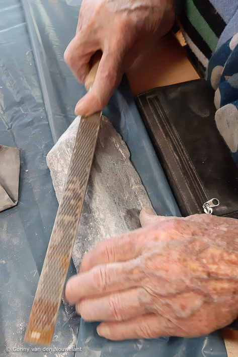 Aan de hand daarvan hebben de deelnemers een speksteen op gevoel uitgekozen en zijn aan de slag gegaan. Met vijlen en mesjes werd in samenwerking met mij aan de steen gewerkt. De steen werd vervolgens afgewerkt door te polijsten met staalwol.