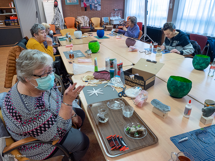 “Onder mijn leiding hebben de deelnemers van de woensdagmiddagactiviteiten-groep drie middagen gewerkt met speksteen met als thema Vrijheid. Samen hebben wij tijdens de eerste bijeenkomst gesproken over het thema Vrijheid: wat betekent Vrijheid voor hen of wat heeft het betekent gezien hun beperkingen voor wat betreft hun gezichtsvermogen.