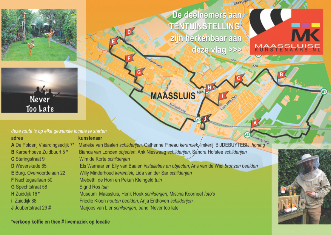 Op zaterdag 24 augustus kunt u bij de Tentuinstelling op 10 locaties genieten van kunst, tuinen en bijzondere plaatsen in Maassluis en omgeving. Een uniek evenement waarbij zo’n 20 kunstenaars en tuinbezitters voor één dag met elkaar verbonden zijn.